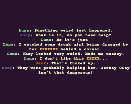 Last XXXXX in Jersey City is a solo, 2-day prototype developed in Scuola Nash. It's a non-linear, narrative-focused puzzle game where you have to guess missing words from chat logs. Each guessed word is a password that unlocks more chat logs, slowly piecing together the story.Engine: Unity